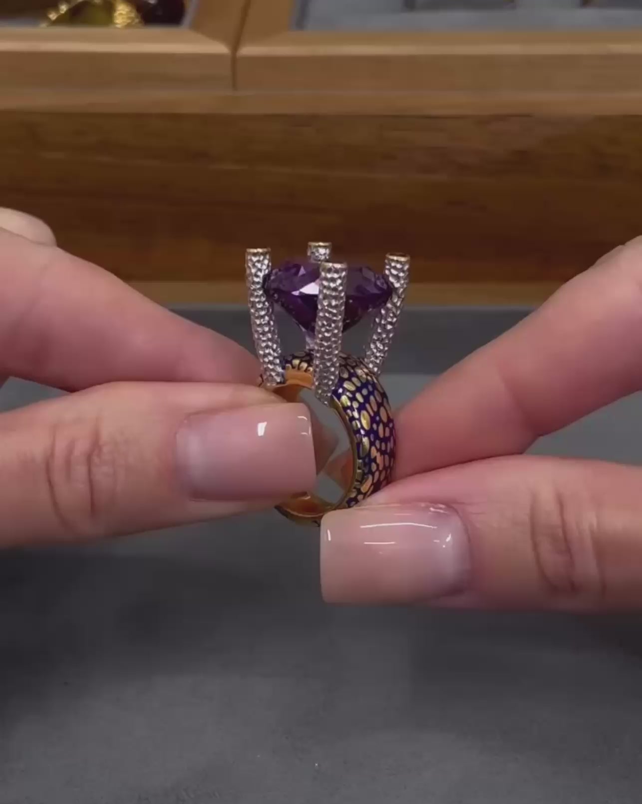 A magical flower blooming in the glow of the night. The deep-hued amethyst shimmers like a mystical crystal, holding the secrets of the universe. Sparkling rhodolites on delicate prongs resemble dewdrops resting on petals. The sterling silver base, coated with 24k gold, is enriched with deep blue enamel, creating an enchanting luminous effect.