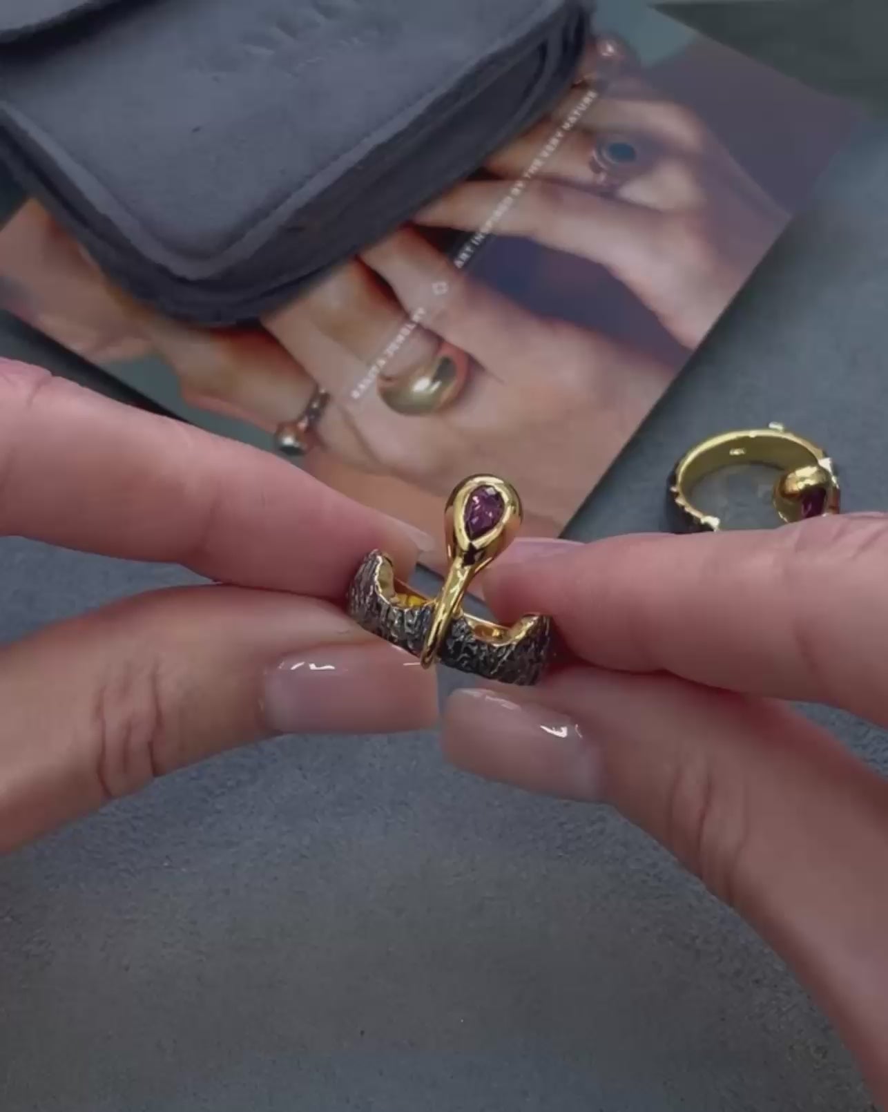 Aurora каблучка, яка привертає увагу. У центрі родоліт, камінь глибокого малинового відтінку, що символізує пристрасть, любов і гармонію. Вважається, що він наповнює власника енергією та натхненням, допомагаючи розкривати внутрішню силу.